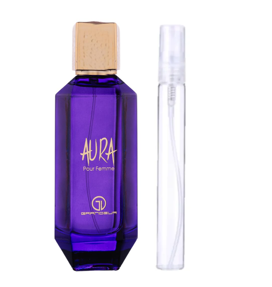 Aura Pour Femme de Grandeur es Dupe Arabe del Perfume Alien de Mugler. La Nota de Salida es jazmín sambac (sampaguita); la Nota de Corazón es cachemira; la Nota de Fondo es ámbar