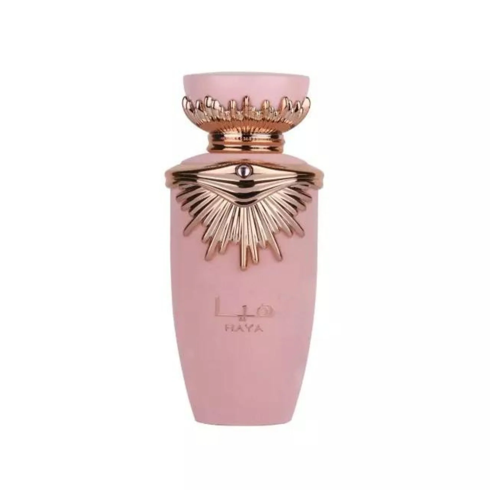 Haya de Lattafa Perfumes; es una fragancia de la familia olfativa unisex. Las Notas de Salida son champaña, naranja sanguina, rosa, naranja tangerina y fresa; las Notas de Corazón son gardenia, jazmín y orquídea de vainilla; las Notas de Fondo son ámbar, sándalo y castaña.